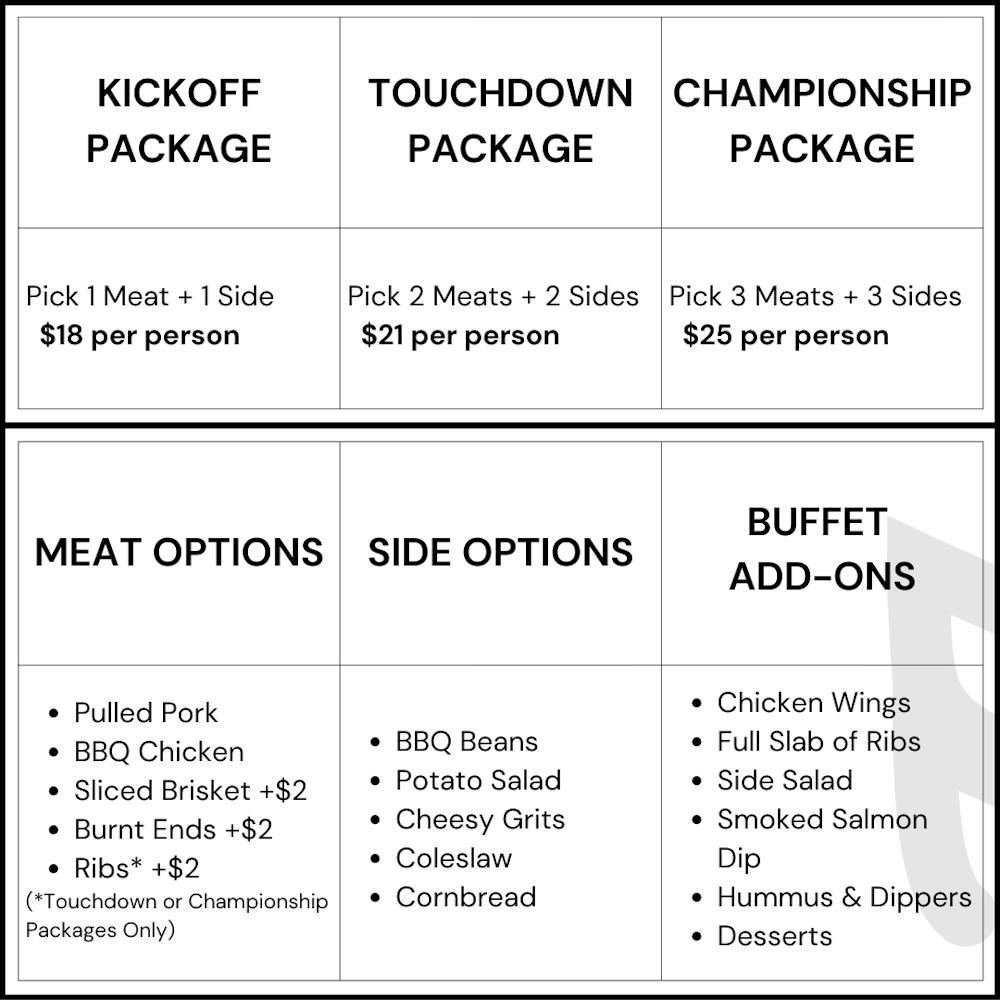 Our buffet packages are perfect for larger groups and come with a variety of BBQ favorites: